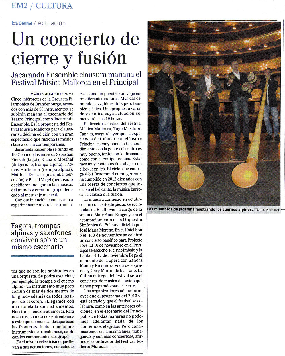 Der Künstlerische Leiter des Festival Música Mallorca, Toyo Masanori, versicherte gestern, dass die Zusammenarbeit mit dem Teatro Principal überaus gut funktioniere: „Wir verstehen uns sehr gut mit den Mitarbeitern des Theaters, ebenso mit der Leitung wie mit dem Team von der Technik. Wir freuen uns, mit ihnen zusammenzuarbeiten“, so Masanori. Der Festivalzyklus, dem Wolf Brummel als Geschäftsführer vorsteht, findet 2012 zum zehnten Mal mit einer Konzertreihe aus Belcanto, Barockmusik, Klassik und Fusion statt.