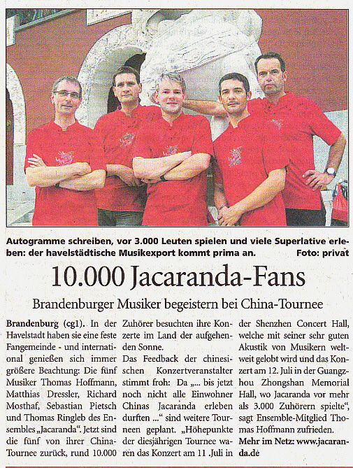 will definitely be planning further tours for the band. Thomas Hoffman a member of the ensemble remarked with satisfaction, "The highlight of this year’s tour was the concert on July 11th in the Shenzhen Concert Hall, a location that is highly acclaimed for its excellent acoustics by musicians from all over the world. Another highlight was the concert on July 12th in the Guangzhou Memorial Hall, in which Jacaranda performed in front of an audience of over 3000 people." More